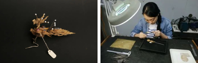 在修復(fù)時(shí),我發(fā)現(xiàn)一件特別神奇的事情,就是冠飾的鳳上都有用彈簧絲頂著的珍珠。當(dāng)把這組冠飾修復(fù)好后擺在那里,只要有人在這個(gè)空間里走動,彈簧上的珍珠就開始不停地顫動,有著非常強(qiáng)烈、自然的動感。