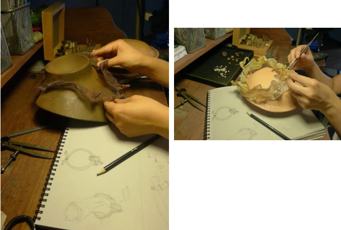 在制作過程中,銅絲采用的是明朝“狄髻”的一種工藝,編織成形后,在上面鎏上漸變的金色,然后就可以綴珍珠了。綴珍珠就是把不同紋理、不同色澤的珍珠,跟彈簧絲一起一個(gè)一個(gè)綴在金絲網(wǎng)上。這是一個(gè)特別享受的過程。
