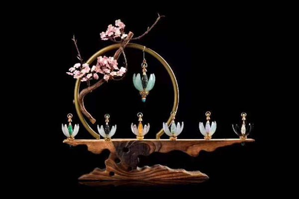 作品融合“蓮花開,真佛現(xiàn)”的創(chuàng)意理念,對翡翠、K黃金、紅藍寶、綠松石、沉香等五寶進行工藝處理,形成完美結(jié)合。作品的主體構(gòu)造由花瓣和花蕊組成,其中花瓣由五片翡翠或貴金屬組成,蘊含“無雜念、無災(zāi)禍”之意;每一片花瓣內(nèi)側(cè)雕刻觀音菩薩、文殊菩薩、普賢菩薩、地藏王、開心佛等諸佛法相;花蕊則選取釋迦牟尼、黑財神等法相?;ò昱c花蕊之間由黃金鑲嵌來實現(xiàn)結(jié)合,頂部有蓮花開合保險扣,底部是蓮花開合機關(guān),花開大小由寶主隨心而為。